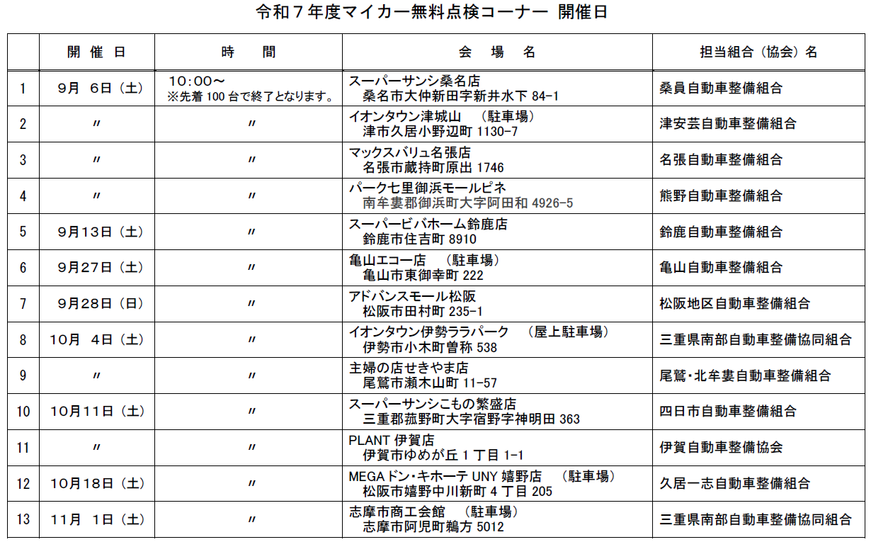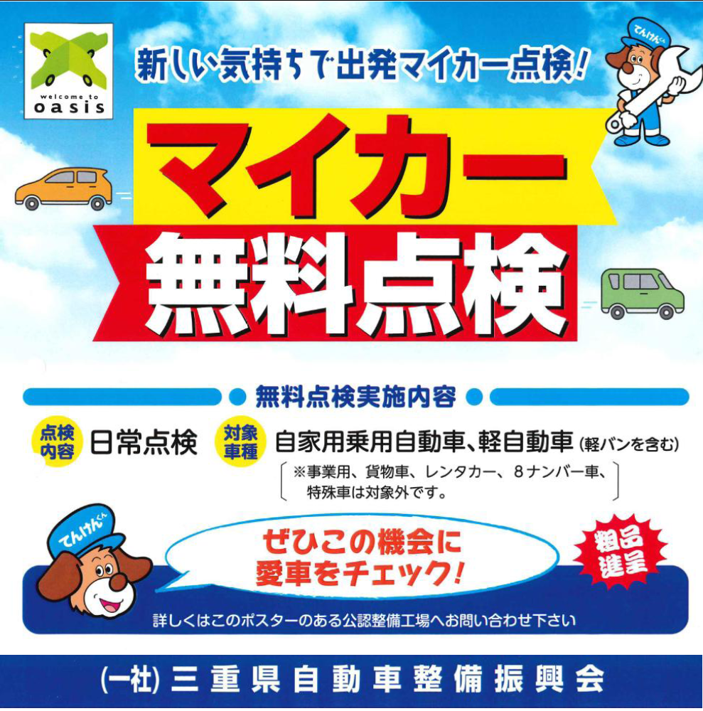 本年度は、以下の日程でマイカー無料点検を開催することとなりました。