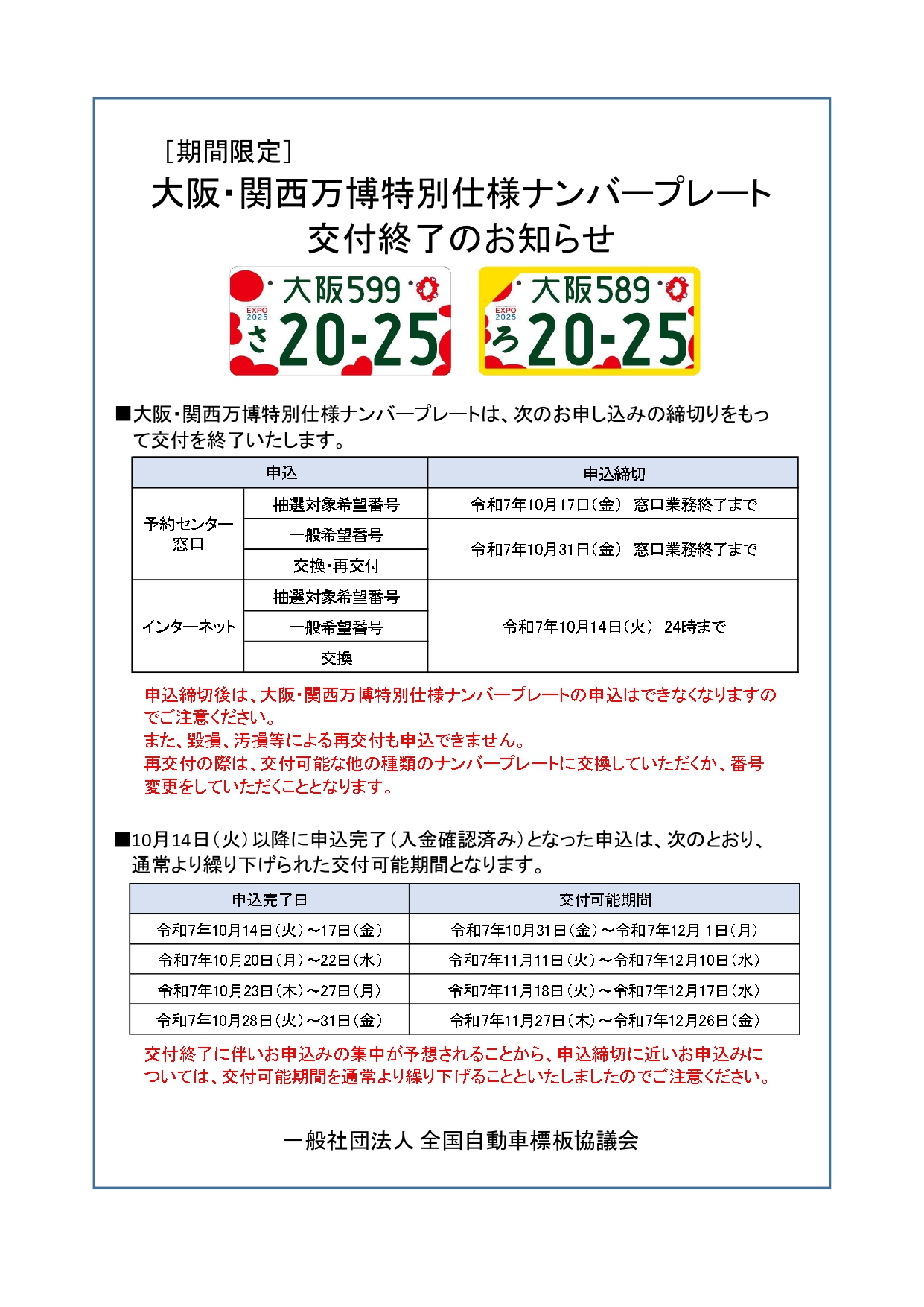 大阪・関西万博特別仕様ナンバープレート交付終了のお知らせ